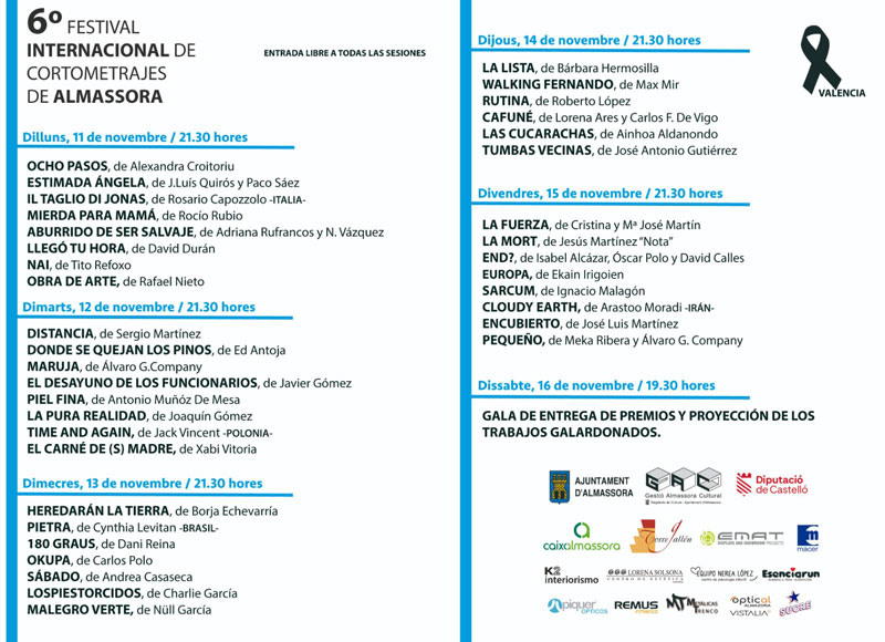 El concejal de Cultura, Vicente Blay Casino, ha animado a todos los amantes del audiovisual a disfrutar de los pases diarios y ha remarcado que el Ayuntamiento de Almassora sigue apostando fuerte por este festival internacional que se ha convertido en una cita imprescindible del audiovisual.