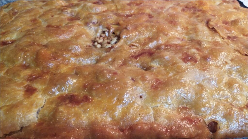 Por otra parte, sobre otro papel vegetal extender la otra mitad de la masa y ponerla sobre el relleno, quitando después el papel vegetal que se ha quedado encima. Una vez cubierto todo, doblar los bordes de la masa y hacer un agujero en el medio para que respire. Pintar la coca con huevo batido. Finalmente, introducirla en el horno precalentado a 180º C hasta que la parte superior esté bien dorada y la parte inferior, también bien cocinada.