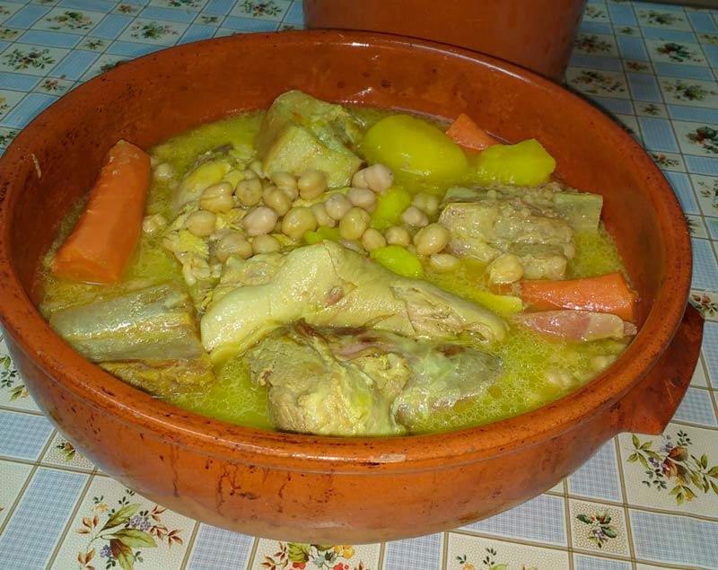 En primer lugar hay que poner la carne en un puchero con agua y dejar hervir. A continuación, bajar a fuego medio y añadir los garbanzos. El gusio debe continuar hirviendo y más tarde introducir las patatas, zanahorias y los cardos. Ir provando el caldo para comprobar el gusto de sal. El guiso deberá estar en el fuego entre dos horas y media y tres horas.